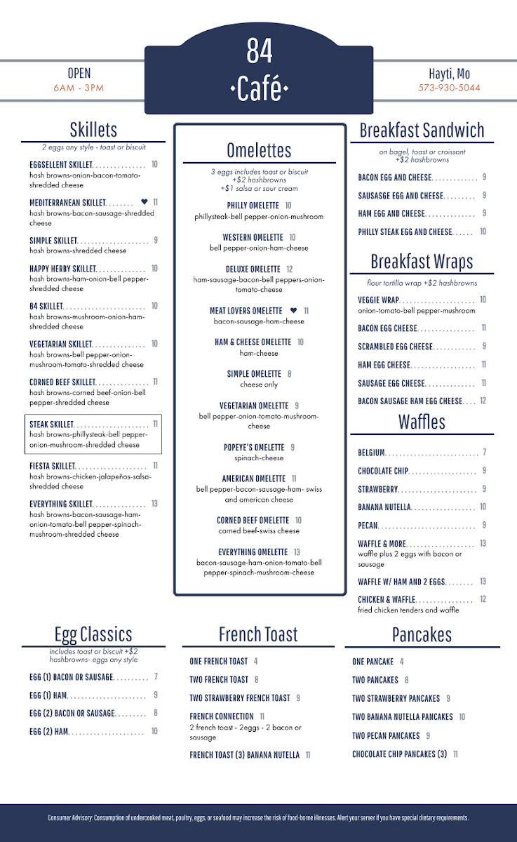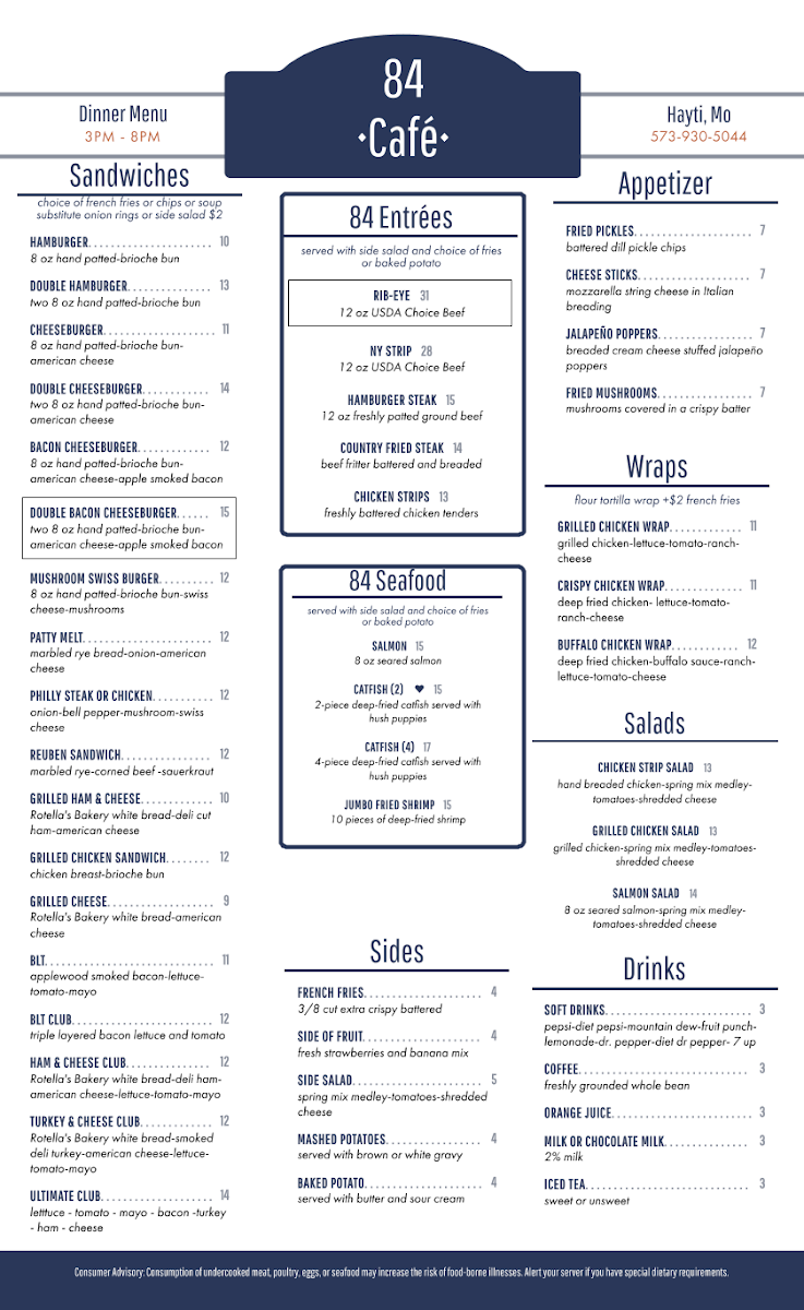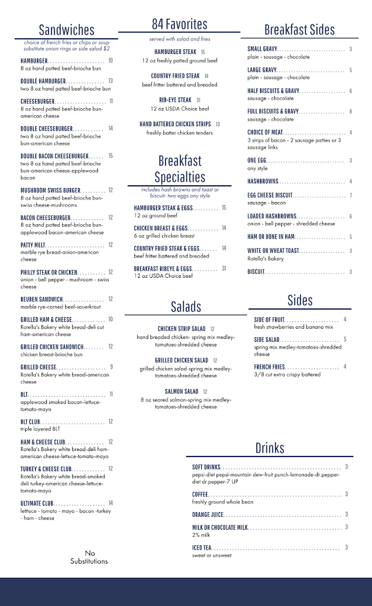There’s something cozy and familiar about discovering what the 84 Café Menu has to offer. This spot along E Washington Street feels like one of those local gems where the food speaks for itself. Expect generous portions, friendly service, and that unmistakable small-town charm that makes each meal feel home-cooked. Breakfast here often steals the show with hearty plates of eggs, pancakes, and sizzling bacon that locals swear by. The lunch and dinner selections keep things simple but satisfying, from classic burgers with crisp fries to sandwiches loaded with fresh ingredients. Regulars also rave about the daily specials that change just enough to keep things interesting. Whether you’re stopping by for a quick bite or settling in for a relaxed meal, this place delivers that comforting, no-fuss dining experience that’s all about good food and genuine flavor.